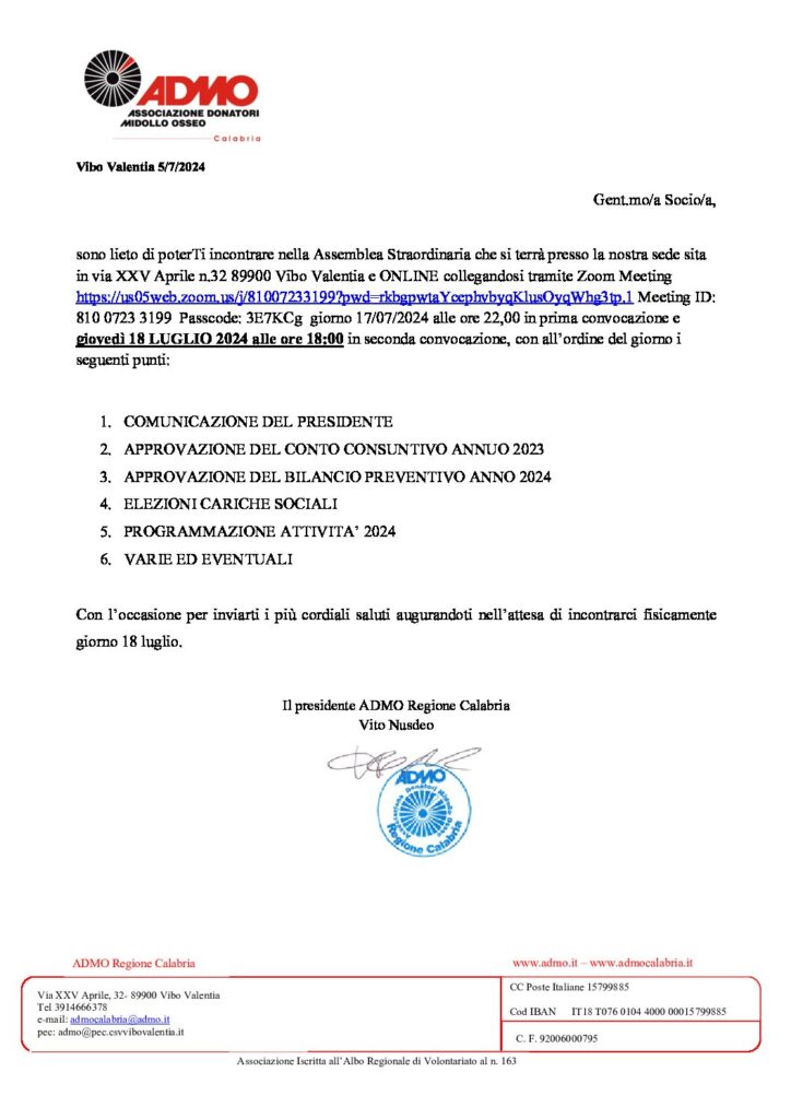 Assemblea Straordinaria dei Soci giorno 18 luglio 2024 18:00 Presso la sede ADMO Regione Calabria Via XXV Aprile 89900 Vibo Valentia Pubblicato il 11/07/202407/02/2025 di ADMO Calabria